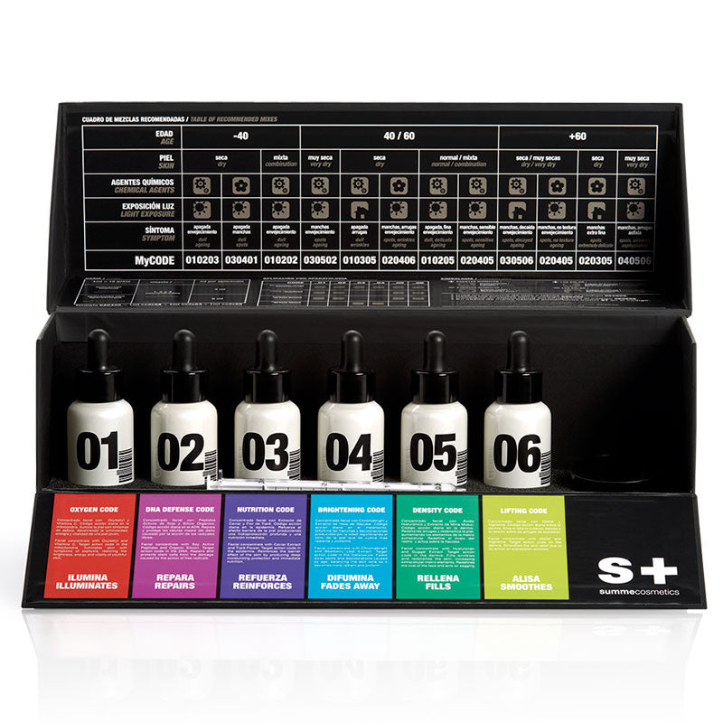 Son seis concentrados faciales, formulados con activos altamente efectivos, que actúan directamente sobre los distintos problemas en el proceso de envejecimiento, mejorando las funciones específicas de la piel. Cada concentrado tiene una “acción de diana” sobre cada tipo de célula, tejido o elemento de la piel. Combina los códigos según las necesidades de la piel. Se pueden mezclar hasta tres concentrados específicos, llegando a cientos de diseños de combinación diferentes. Un auténtico trato individualizado a la medida de cada cliente. Está especialmente diseñado para su uso con diversos equipos manuales y electroestéticos.
